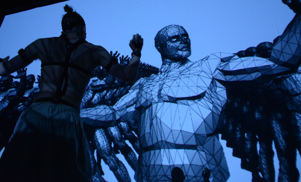 The work also follows a somewhat classical structure with three movements. In the first movement, we see the human body in a raw form (it's a very physical, highly choreographic section with minimal projections), in the second movement, we see a duet between the performer and an avatar responding and coded to respond to movements in various ways. In the third movement, we see a pacified, passive body being actively "scanned" by projection mapping software. The three movements take us on a surreal journey from the body as active, into a hybrid technological space, and finally into a passive body subsumed by technological forces.