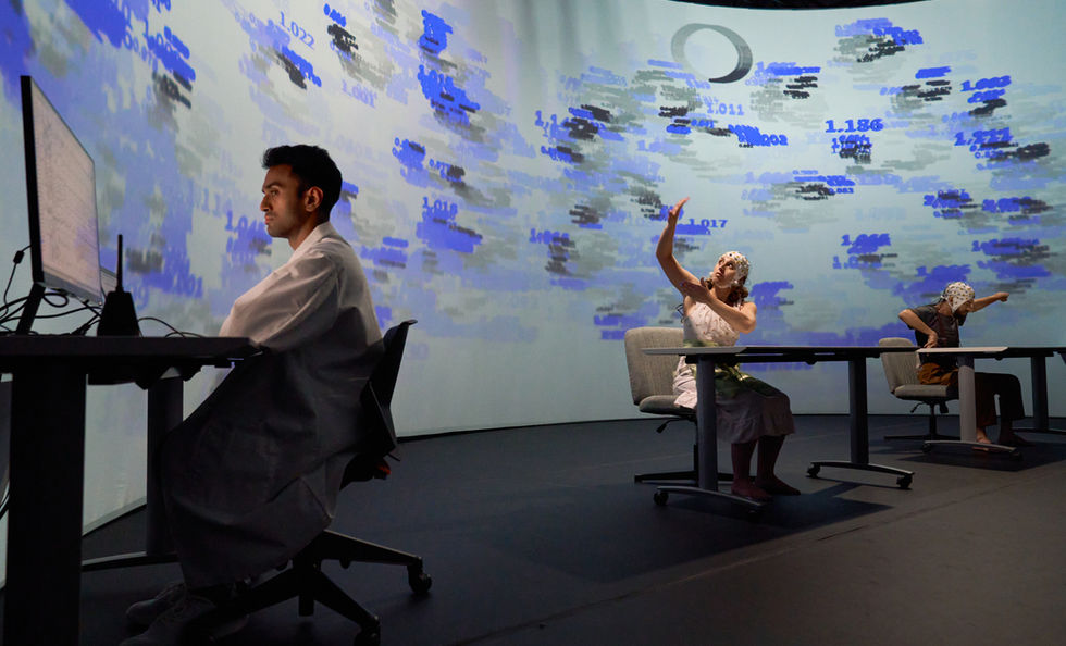 epiphany machine (2024) is a neuroballet for two subjects using live electroencephalography (EEG) to visualize the brain activity of dancers in a variety of performance states. Traditionally, the brain has been studied in stillness, but recent advances in Mobile Brain Body Imaging (MoBI) have enhanced our ability to study the moving brain of not only one but two or more individuals during interactive experiences. The resulting piece is a hybrid performance event, existing as both a concert work of dance and as a scientific study into the effects of dance on brain activity. It is an interdisciplinary, collaborative investigation into livestreaming and visualize the brain activity of dancers in a variety of choreographic tasks including meditative states with the eyes closed (affecting alpha oscillations), repetitive choreographic states (affecting beta oscillations), and spatial improvisations (affecting theta oscillations).
